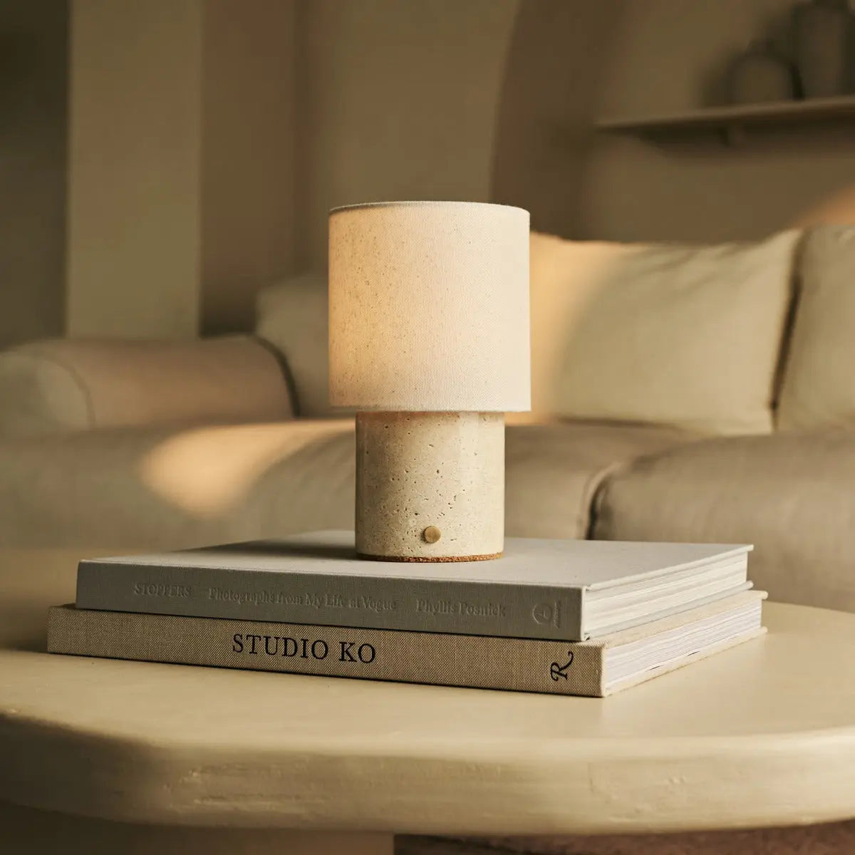 Dou Beige / Travertino Classico – Travertine Rechargeable Table Lamp – Cordless, 3 Light Modes & With Linen Interchangeable Lampshade