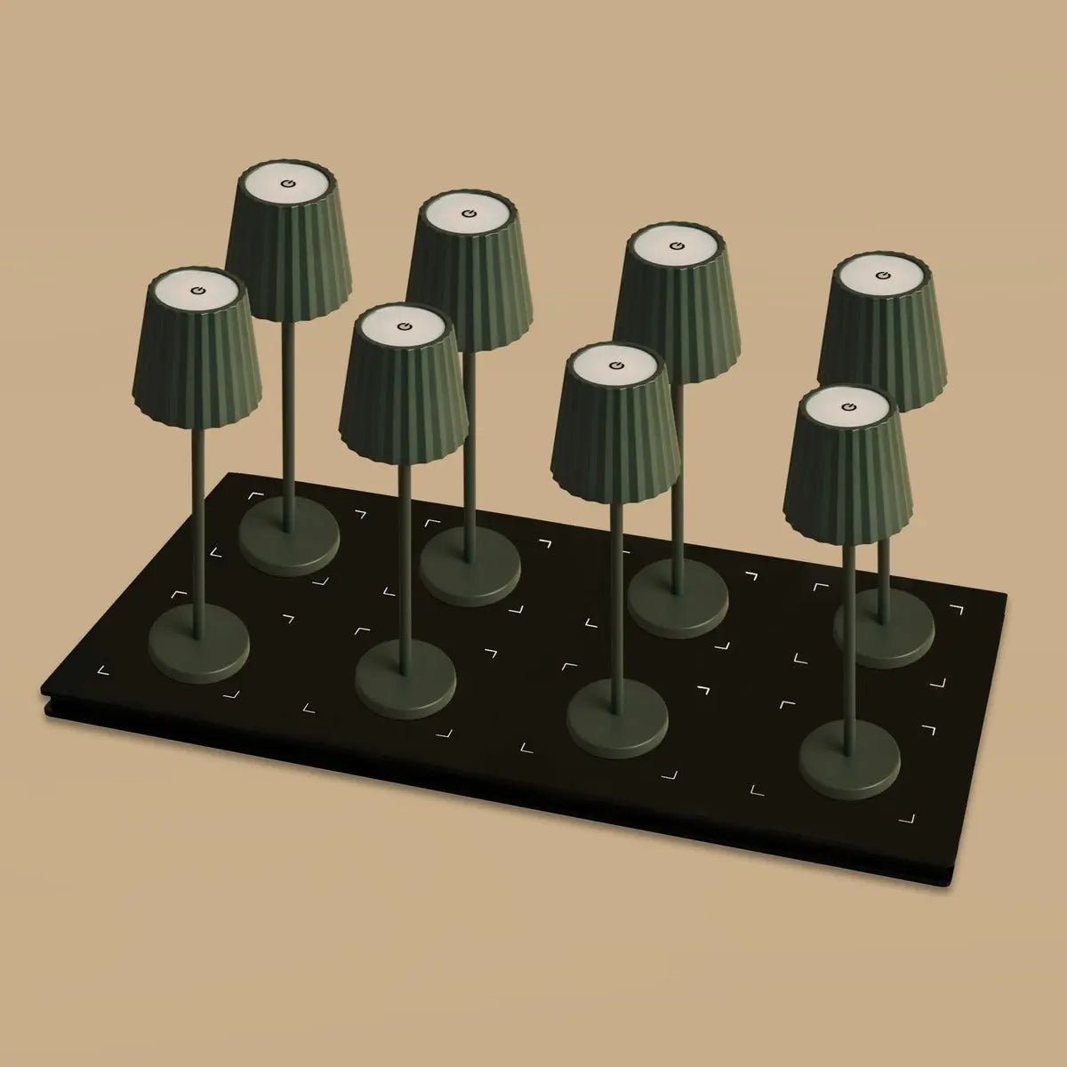 Central Station Professional Wireless Charging Dock with 8 Charging Slots – Easy & Functional with Qi Technology Keep all your Tavellio rechargeable lamps effortlessly powered! This innovative professional wireless charging station with built-in Qi technology allows you to charge up to eight lamps simultaneously, eliminating the hassle of tangled cables and multiple outlets. The charger features built-in protection against overheating and overcharging, ensuring a safe and reliable charging process.With its modern and space-saving design, this charging dock is a perfect addition to your home, office, or hospitality space. Simply place your lamps on the pad and enjoy efficient, hassle-free charging. Whether you’re setting the perfect ambiance or ensuring your workspace stays well-lit, this charging station keeps your lamps ready to use at all times.In addition to Tavellio lamps, you can also charge your phone simultaneously on the charging dock. Upgrade your charging experience today and enjoy a clutter-free, efficient, and stylish solution for all your devices. Specifications · Material: Aluminum · Colors: Matte Black · Classification: IP20 · Non-slip · Not every lamp can be charged via the charging station, check the specifications of the lamp