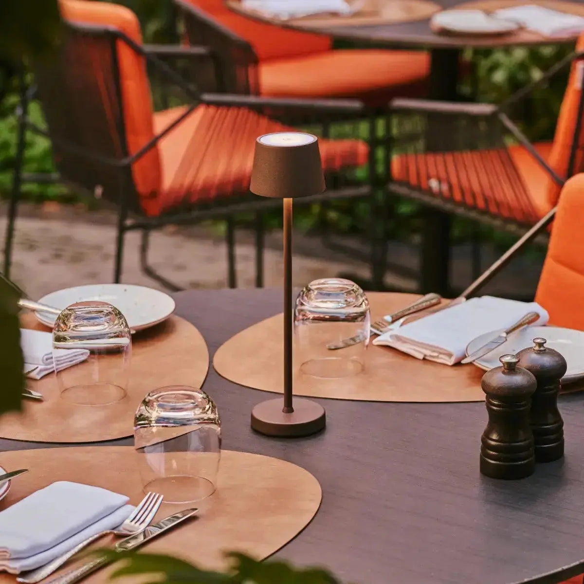 Combi Set Professional – 8 x Vondel Mini Mocha Brown Rechargeable Table Lamps & 1 x Central Station Wireless Charging Station with Q1-Technology – Perfect for Restaurants, Hospitality & Hotels All-in-one solution: This combi set includes 8 stylish, cordless table lamps and 1 wireless charging station. Thanks to the smart design, all lamps can be charged simultaneously by simply placing them on the charging station. With Qi technology, smartphones and smartwatches can also be charged wirelessly. The charger features built-in protection against overheating and overcharging, ensuring a safe and reliable charging process.Rechargeable & wireless: Enjoy complete flexibility with the cordless design. The table lamps are powered by a high-capacity rechargeable battery, which can be easily charged via the included USB cable or the wireless charging station. With an impressive battery life of up to 60 hours, you’re always assured of ambient lighting.Easy use: With just a single touch, you can turn the lamps on or off. Choose from three different light modes – candlelight, ambient light, or work light – to create the perfect atmosphere for any setting.Dimmable function: Easily adjust the brightness with the touch-dim button to ensure the ideal lighting intensity for any occasion.Eco-friendly choiceMade from high-quality iron, these lamps are not only durable and wear-resistant but also fully recyclable. Iron withstands both warm and cold conditions, making these lamps a sustainable choice for long-term use. Specifications Dimensions: 8 cm Ø, 30 cm height Material: Metal (Iron) Battery: 2000 mAh (7 to 60 hours, depending on dim function usage) Light modes: 3 (2700K-4000K-6000K) Classification: IP54 – Water-resistant and dustproof Classification charging station: IP20 Handmade, anti-slip, cordless & easy to dim Rechargeable via the included USB-C cable or the wireless charging station