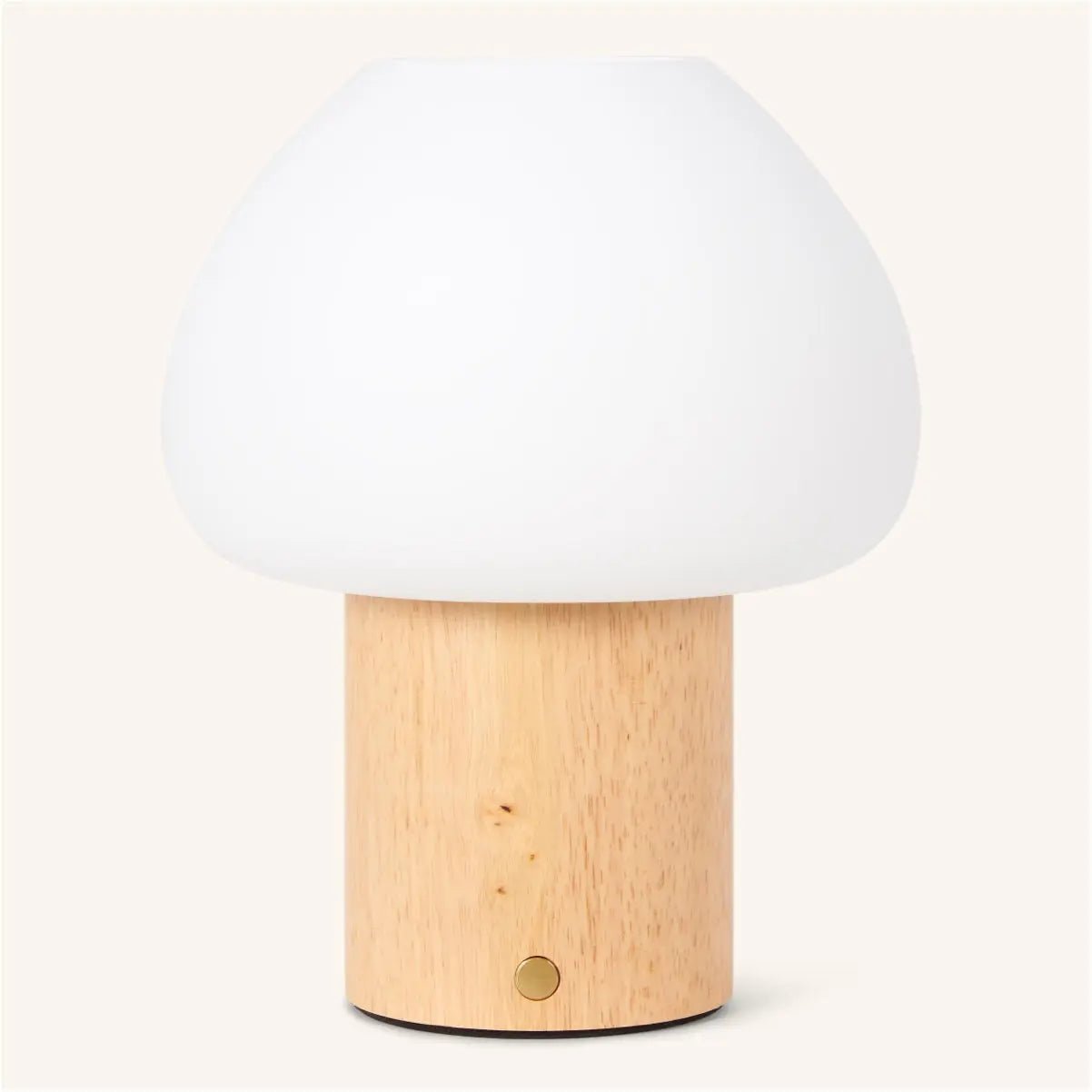 Fynn Light Brown Wooden Lamp – Rechargeable, Dimmable & Stylish Stylish model: the Fynn wooden lamp, a unique design from the Tavellio collection. This lamp is designed with modernity in mind.Rechargeable and cordless: Thanks to its rechargeable and cordless design, you can easily move the table lamp without regard to power outlets. The built-in battery is quick to recharge via the included USB cable and provides up to 80 hours of illumination, so you are always assured of adequate lighting.Easy use: The lamp is easy to operate with just one simple touch. This allows you to easily turn the lamp on or off. You have a choice of 3 different light colors (candlelight, mood light and work light), allowing you to always create the right atmosphere, whether you are relaxing, working or just want to light up the room.Dimmable function: The light intensity of the lamp can be adjusted as desired using the touch-dim button which ensures the right ambiance of your choice. Eco-friendly choice: The lamp is crafted of rubberwood, one of the most eco-friendly woods. It contributes to a circular wood industry because it is only used after the full life of the tree. Its use promotes sustainable forest management and helps reduce waste. The lamp has low power consumption.Applicability: With its cordless design and convenient USB charging capability, the Fynn wooden lamp brings not only light, but ultimate convenience to your environment. Choose between light brown or dark brown to match the lamp to your personal style and decor. Specifications · Dimensions: 17 cm Ø, 25 cm high · Material: Rubberwood, frosted glass · Battery: 4000 mAh (10 to 80 hours, depending on use dimming function) · Light modes: 3 (2700K-4000K-6000K) · Classification: IP 44: (dust and water splash proof) · Handmade, anti-slip, cordless & easy dimmable · USB-C rechargeable, cable included