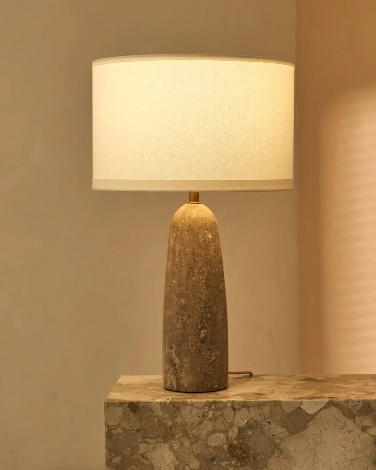 Isla Travertine Lamp with Cotton Shade – Elegant and Timeless The Isla has a beautiful solid travertine base with a white/beige cotton shade of high quality. This sturdy lamp is a true addition to any interior. Travertine is a sedimentary rock consisting mainly of calcium carbonate, formed by the precipitation of minerals from fresh water, such as springs and rivers. Travertine is prized for its natural beauty and unique textures, characterized by pores and hollows. Travertine is popular in both modern and classic interiors because of its timeless look and natural charm. Crafted from travertine this Tavellio table lamp brings a warm and inviting touch to any room. The fabric cord adds a subtle retro charm, making it a perfect fit for both modern and classic interiors. A timeless piece that combines design and function with ease. Specifications• Dimensions: 38 cm Ø and 63 cm high • Handmade of travertine and a cotton shade• E27 socket, light bulb not included • Two meter long cord with EU plug• Controllable via on/off switch on the cord