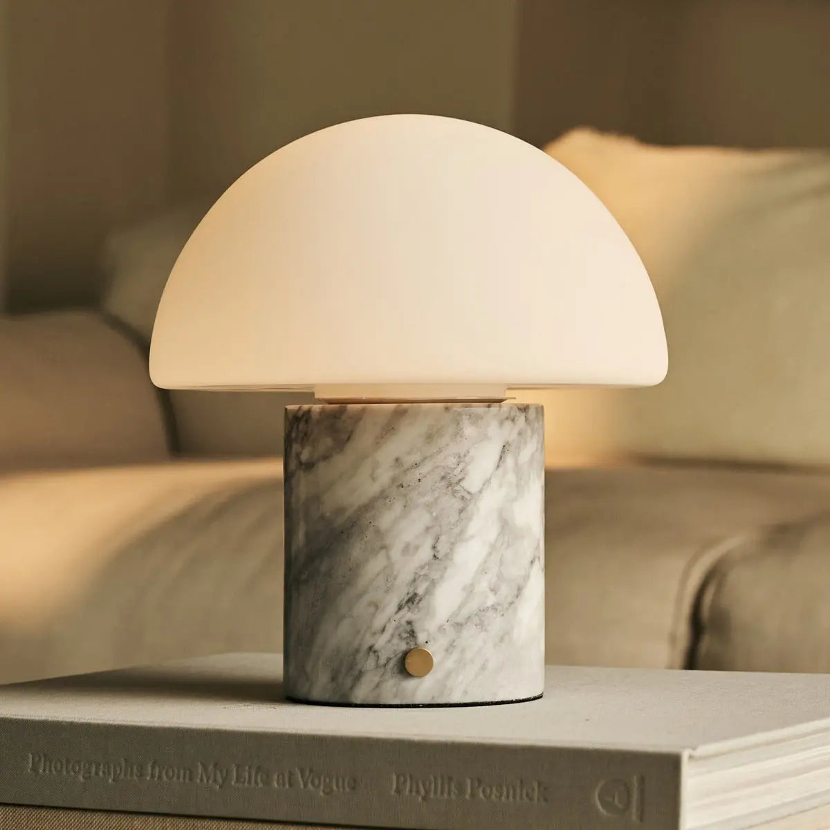 Maris White / Bianco Statuarietto – Classic Marble Rechargeable Table Lamp with 3 Light Colors & Dimming Function Stylish model: The Maris is part of our Rijks Collection. Each table lamp is crafted from solid marble or travertine, making every piece truly one of a kind. The natural veining and deep color variations give each lamp a unique and exclusive look.Modular design: This lamp features an interchangeable lampshade, allowing you to effortlessly change the style and ambiance. Switch from glass to fabric, matching to the season or your interior.Rechargeable and cordless: Thanks to its rechargeable and cordless design, you can easily move the table lamp without regard to power outlets. The built-in battery is quick to recharge via the included USB cable and provides up to 100 hours of illumination, so you are always assured of adequate lighting.Easy use: The lamp is easy to operate with just one simple touch. This allows you to easily turn the lamp on or off. You have a choice of 3 different light colors (candlelight, mood light and work light), allowing you to always create the right atmosphere, whether you are relaxing, working or just want to light up the room.Dimmable function: The light intensity of the lamp can be adjusted as desired using the touch-dim button which ensures the right ambiance of your choice.Eco-friendly choice: The lamp is made of marble. Marble is a timeless and durable natural material known for its elegant appearance and long lifespan. It is strong, wear-resistant, and retains its beauty for many years, making it a responsible choice.Applicability: The Maris brings timeless elegance to your interior, completely wireless for ultimate ease of use. Crafted from unique solid marble, this lamp effortlessly enhances any space and creates the perfect atmosphere wherever you place it. Specifications · Dimensions: 18 cm Ø, 19 cm high · Material: Marble Bianco Statuariettoi, glass · Battery: 6000 mAh (10 to 100 hours, depending on use dimming function) · Light modes: 3 (2700K-4000K-6000K) · Classification: IP 20: (suitable for dry indoor areas) · Handmade, anti-slip, cordless & easy dimmable · USB-C rechargeable, cable included · Modular design features a replaceable lampshade
