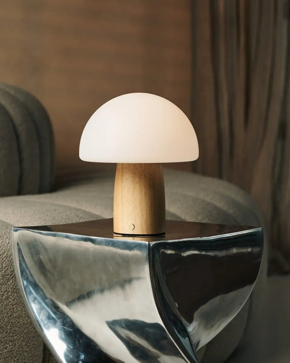 Mia Light Brown Stylish Wooden Table Lamp with Dimmer – Wood, Functional & Subtle Stylish model: The Mia is an elegant wooden table lamp with dimmer. Thanks to three light colors and adjustable brightness, you can easily adjust the atmosphere to your preference.Rechargeable and cordless: Thanks to its rechargeable and cordless design, you can easily move the table lamp without regard to power outlets. The built-in battery is quick to recharge via the included USB cable and provides up to 10be0 hours of illumination, so you are always assured of adequate lighting.Easy use: The lamp is easy to operate with just one simple touch. This allows you to easily turn the lamp on or off. You have a choice of 3 different light colors (candlelight, mood light and work light), allowing you to always create the right atmosphere, whether you are relaxing, working or just want to light up the room.Dimmable function: The light intensity of the lamp can be adjusted as desired using the touch-dim button which ensures the right ambiance of your choice.Eco-friendly choice: The lamp is crafted of rubberwood, one of the most eco-friendly woods. It contributes to a circular wood industry because it is only used after the full life of the tree. Its use promotes sustainable forest management and helps reduce waste. The lamp has low power consumption.Applicability: This LED table lamp with dimmer is rechargeable and portable, ideal for any table setting. The shade diffuses soft, inviting light. Specifications · Dimensions: 20 cm Ø, 23 cm high · Material: Rubberwood, polythene · Battery: 5000 mAh (10 to 100 hours, depending on use dimming function) · Light modes: 3 (2700K-4000K-6000K) · Classification: IP 44: (dust and water splash proof) · Handmade, anti-slip, cordless & easy dimmable · USB-C rechargeable, cable included