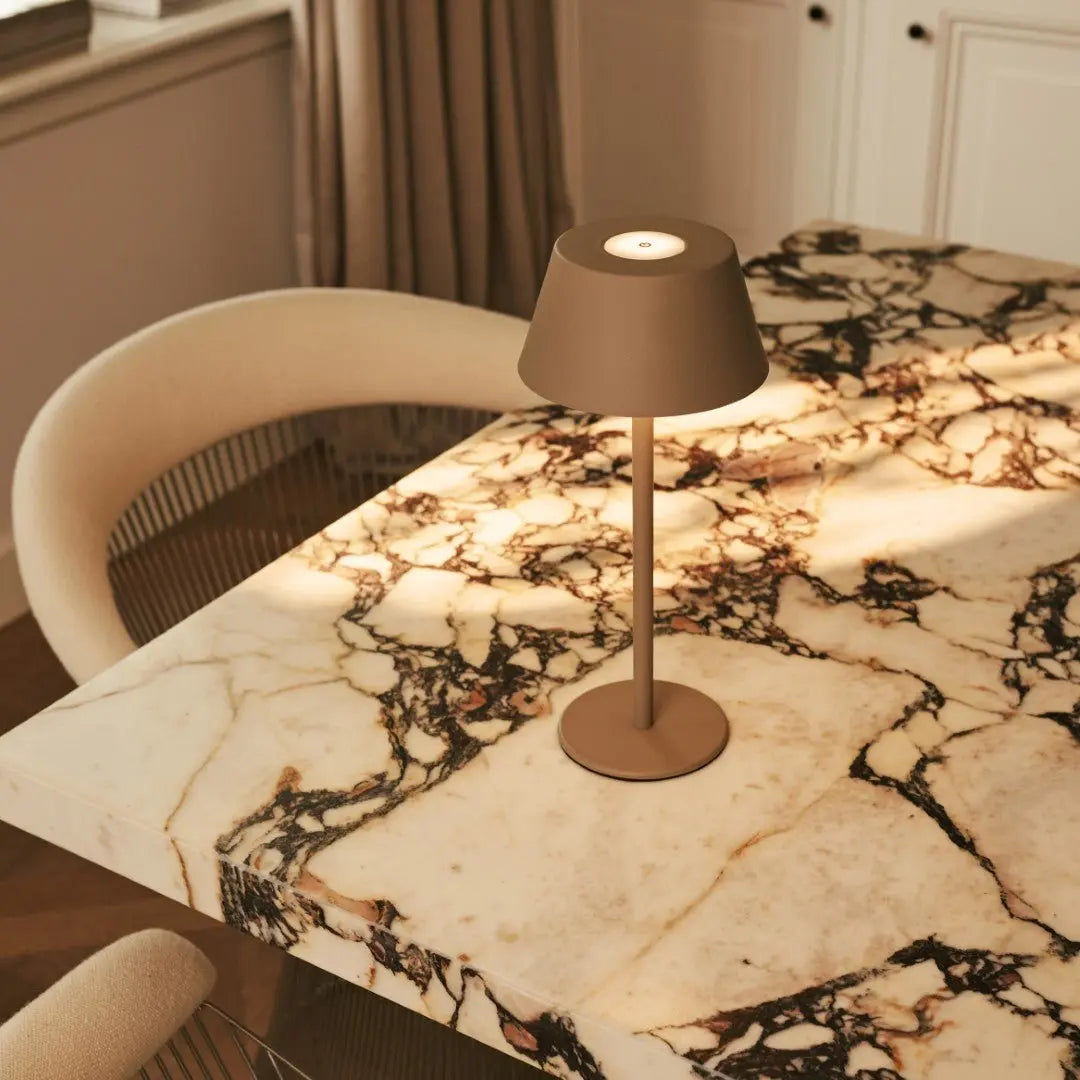 Milou Koala Brown – Table lamp without Cable l Modern, Design & 3 Light modes Stylish model: This table lamp without cable has a stable design and a warm, inviting look. The light radiates atmospherically upwards, and thanks to the dimming function and multiple light modes, you can easily adjust the lighting to your preference.Rechargeable and cordless: Thanks to its rechargeable and cordless design, you can easily move the table lamp without regard to power outlets. The built-in battery is quick to recharge via the included USB cable and provides up to 120 hours of illumination, so you are always assured of adequate lighting.Easy use: The lamp is easy to operate with just one simple touch. This allows you to easily turn the lamp on or off. You have a choice of 3 different light colors (candlelight, mood light and work light), allowing you to always create the right atmosphere, whether you are relaxing, working or just want to light up the room.Dimmable function: The light intensity of the lamp can be adjusted as desired using the touch-dim button which ensures the right ambiance of your choice.Eco-friendly choice: The lamp is crafted of iron, a strong and durable material that is ideal for daily use. Its sustainable design ensures it is suitable for long-term use. Furthermore, iron can withstand hot and cold conditions and is fully recyclable.Applicability: Dimmable, rechargeable and stylish: this table lamp without cable is ideal for restaurants and living rooms. Just need to choose your favorite color. Specifications · Dimensions: 10 cm Ø, 30 cm high · Material: Metal iron · Battery: 5200 mAh (10 to 120 hours, depending on use dimming function) · Light modes: 3 (2700K-4000K-6000K) · Classification: IP 54: (water-repellent and dust-free) · Handmade, anti-slip, cordless & easy dimmable · USB-C rechargeable, cable included