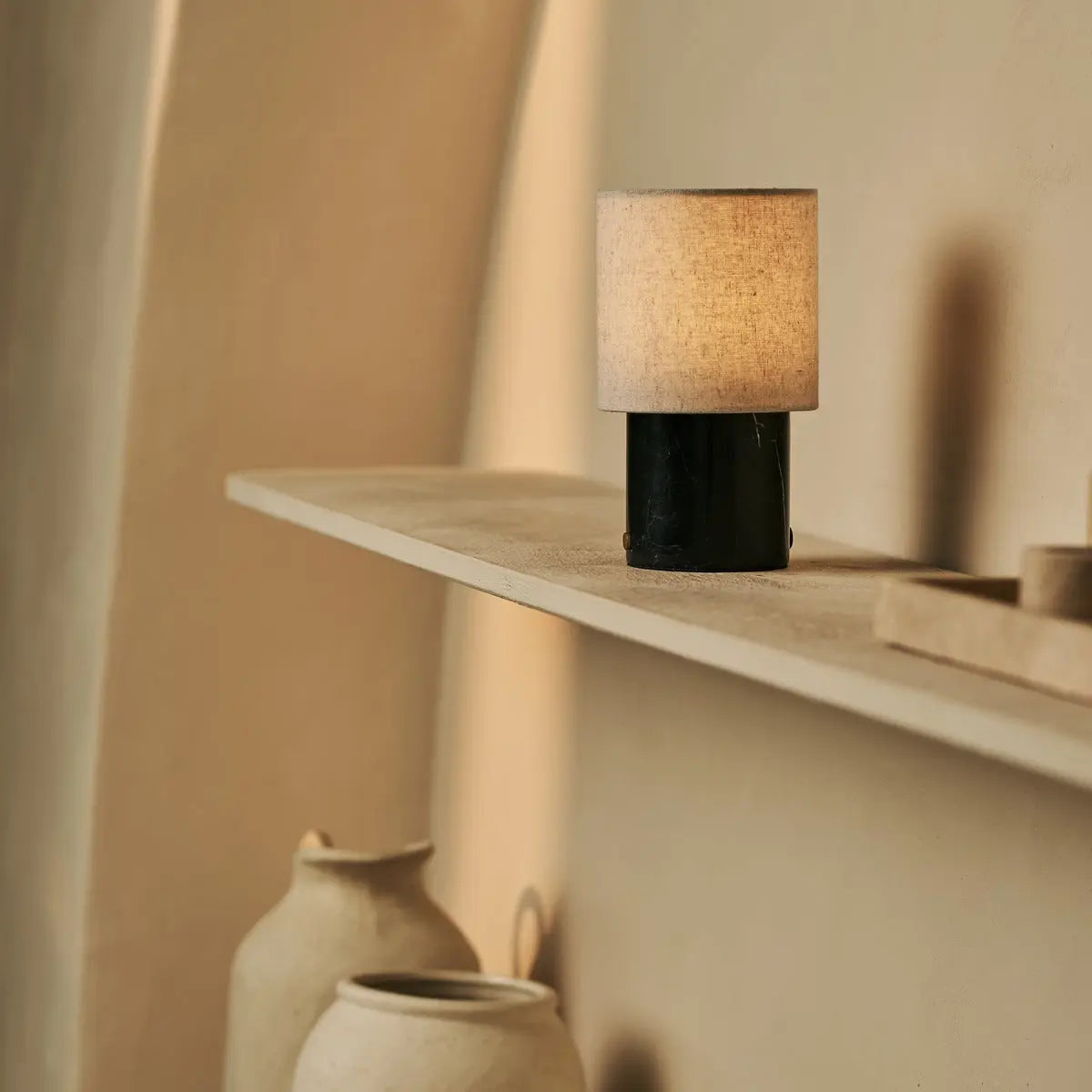 Onoda Black / Nero Marquina – Marble Rechargeable Table Lamp – With Linen Interchangeable Lampshade & Rechargeable Design Stylish model: The Onoda is part of our Rijks Collection. Each table lamp is crafted from solid marble, making every piece truly one of a kind. The natural veining and deep color variations give each lamp a unique and exclusive look. This lamp features an interchangeable lampshade, allowing you to easily change its style and ambiance. Switch from glass to fabric, matching the season or your interior.Modular design: This lamp features an interchangeable lampshade, allowing you to effortlessly change the style and ambiance. Switch from linen to glass, matching to the season or your interior.Rechargeable and cordless: Thanks to its rechargeable and cordless design, you can easily move the table lamp without regard to power outlets. The built-in battery is quick to recharge via the included USB cable and provides up to 100 hours of illumination, so you are always assured of adequate lighting.Easy use: The lamp is easy to operate with just one simple touch. This allows you to easily turn the lamp on or off. You have a choice of 3 different light colors (candlelight, mood light and work light), allowing you to always create the right atmosphere, whether you are relaxing, working or just want to light up the room.Dimmable function: The light intensity of the lamp can be adjusted as desired using the touch-dim button which ensures the right ambiance of your choice.Eco-friendly choice: The lamp is made of marble. Marble is a timeless and durable natural material known for its elegant appearance and long lifespan. It is strong, wear-resistant, and retains its beauty for many years, making it a responsible choice.Applicability: The Onoda exudes timeless elegance and fits seamlessly into any interior. The combination of beautiful solid marble and an elegant linen shade gives the lamp a luxurious look. Thanks to its fully cordless design, you can enjoy ultimate convenience and create the perfect ambiance anywhere. Specifications · Dimensions: 12 cm Ø, 22 cm high · Material: Marble Nero Marquina, linen · Battery: 6000 mAh (10 to 100 hours, depending on use dimming function) · Light modes: 3 (2700K-4000K-6000K) · Classification: IP 20: (suitable for dry indoor areas) · Handmade, anti-slip, cordless & easy dimmable · USB-C rechargeable, cable included · Modular design features a replaceable lampshade