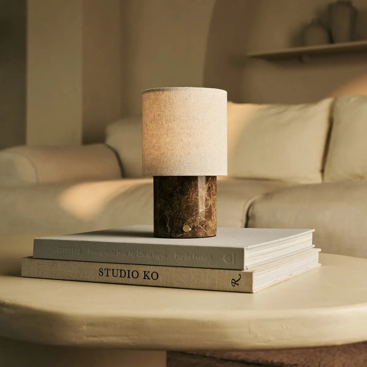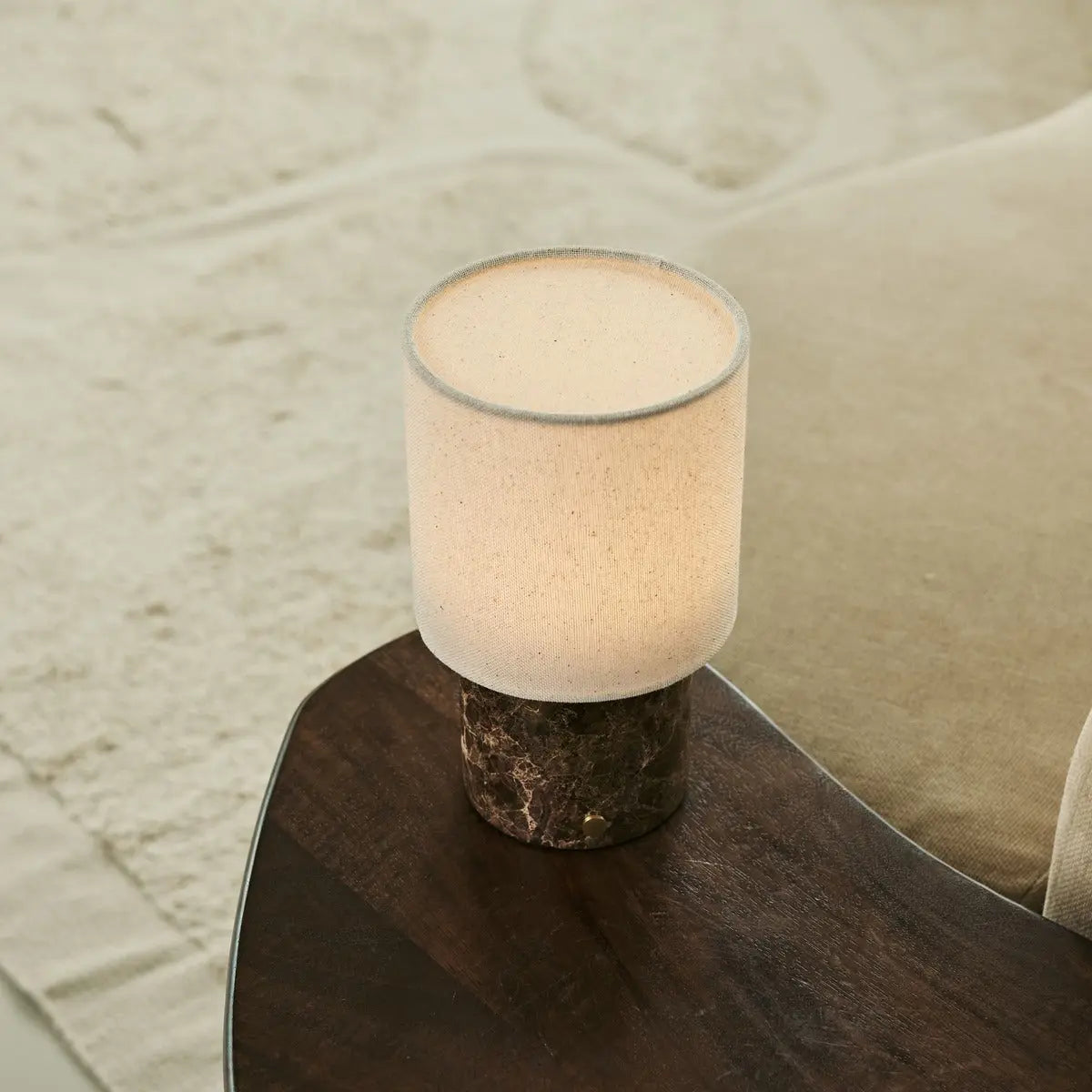 Onoda Brown / Emperador Dark – Marble Rechargeable Table Lamp – With Linen Interchangeable Lampshade & Rechargeable Design Stylish model: The Onoda is part of our Rijks Collection. Each table lamp is crafted from solid marble, making every piece truly one of a kind. The natural veining and deep color variations give each lamp a unique and exclusive look. This lamp features an interchangeable lampshade, allowing you to easily change its style and ambiance. Switch from glass to fabric, matching the season or your interior.Modular design: This lamp features an interchangeable lampshade, allowing you to effortlessly change the style and ambiance. Switch from linen to glass, matching to the season or your interior.Rechargeable and cordless: Thanks to its rechargeable and cordless design, you can easily move the table lamp without regard to power outlets. The built-in battery is quick to recharge via the included USB cable and provides up to 100 hours of illumination, so you are always assured of adequate lighting.Easy use: The lamp is easy to operate with just one simple touch. This allows you to easily turn the lamp on or off. You have a choice of 3 different light colors (candlelight, mood light and work light), allowing you to always create the right atmosphere, whether you are relaxing, working or just want to light up the room.Dimmable function: The light intensity of the lamp can be adjusted as desired using the touch-dim button which ensures the right ambiance of your choice.Eco-friendly choice: The lamp is made of marble. Marble is a timeless and durable natural material known for its elegant appearance and long lifespan. It is strong, wear-resistant, and retains its beauty for many years, making it a responsible choice.Applicability: The Onoda exudes timeless elegance and fits seamlessly into any interior. The combination of beautiful solid marble and an elegant linen shade gives the lamp a luxurious look. Thanks to its fully cordless design, you can enjoy ultimate convenience and create the perfect ambiance anywhere. Specifications · Dimensions: 12 cm Ø, 22 cm high · Material: Marble Emperador Dark, linen · Battery: 6000 mAh (10 to 100 hours, depending on use dimming function) · Light modes: 3 (2700K-4000K-6000K) · Classification: IP 20: (suitable for dry indoor areas) · Handmade, anti-slip, cordless & easy dimmable · USB-C rechargeable, cable included · Modular design features a replaceable lampshade