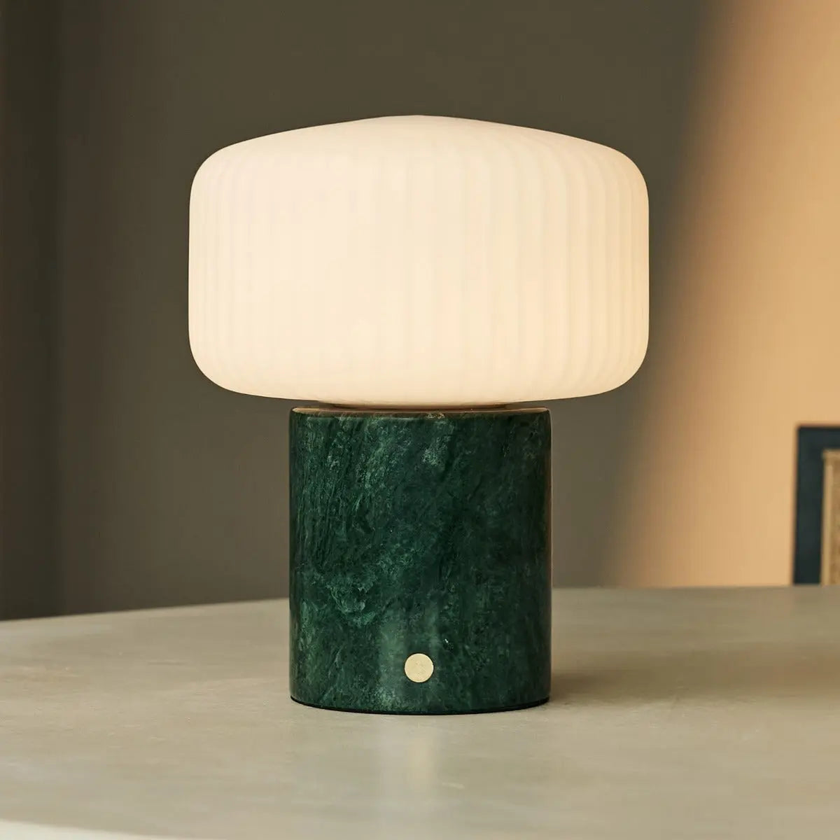 Renoir Green / Verde Alpi – Marble Rechargeable Table Lamp – Cordless, USB Rechargeable & Up to 100 Hours of Illumination Stylish model: The Renoir is part of our Rijks Collection. Each table lamp is crafted from solid marble, making every piece truly one of a kind. The natural veining and deep color variations give each lamp a unique and exclusive look. This lamp features an interchangeable lampshade, allowing you to easily change its style and ambiance. Switch from glass to fabric, matching the season or your interior.Modular design: This lamp features an interchangeable lampshade, allowing you to effortlessly change the style and ambiance. Switch from glass to fabric, matching to the season or your interior.Rechargeable and cordless: Thanks to its rechargeable and cordless design, you can easily move the table lamp without regard to power outlets. The built-in battery is quick to recharge via the included USB cable and provides up to 100 hours of illumination, so you are always assured of adequate lighting.Easy use: The lamp is easy to operate with just one simple touch. This allows you to easily turn the lamp on or off. You have a choice of 3 different light colors (candlelight, mood light and work light), allowing you to always create the right atmosphere, whether you are relaxing, working or just want to light up the room.Dimmable function: The light intensity of the lamp can be adjusted as desired using the touch-dim button which ensures the right ambiance of your choice.Eco-friendly choice: The lamp is made of marble. Marble is a timeless and durable natural material known for its elegant appearance and long lifespan. It is strong, wear-resistant, and retains its beauty for many years, making it a responsible choice.Applicability: The Renoir combines style and functionality in one elegant lamp. Its marble base with refined glass adds a touch of luxury to any interior, while the versatile design ensures it fits perfectly in any space. A true eye-catcher and a practical addition to your home. Specifications · Dimensions: 16 cm Ø, 20 cm high · Material: Marble Verde Alpi, glass · Battery: 6000 mAh (10 to 100 hours, depending on use dimming function) · Light modes: 3 (2700K-4000K-6000K) · Classification: IP 20: (suitable for dry indoor areas) · Handmade, anti-slip, cordless & easy dimmable · USB-C rechargeable, cable included · Modular design features a replaceable lampshade